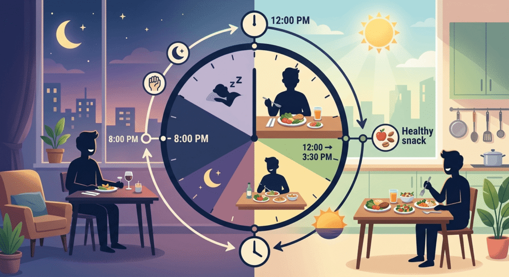 Attempt to eat and fast at the same time as much as possible. This is used in order to control the internal clock of your body.