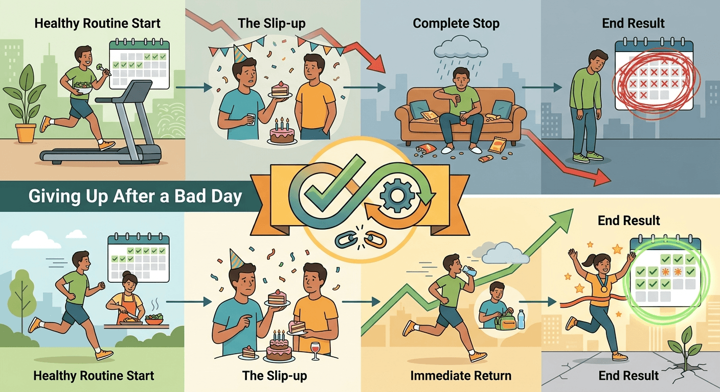 The most common factor that causes people to fail is not the lack of knowledge on what to do but rather giving up after a single bad day. When you have a slice of cake at a birthday party, do not dispose of the entire month.