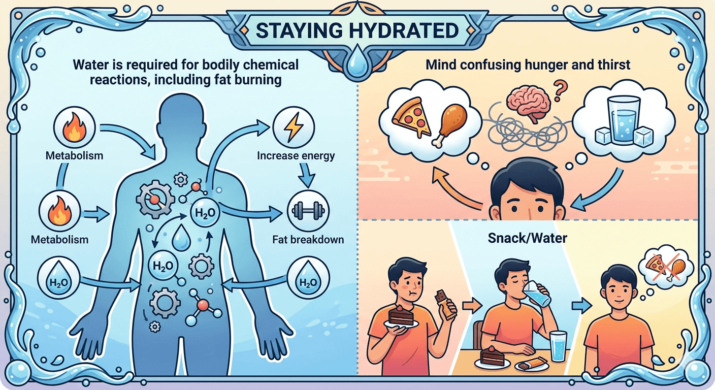 Water is required in all of your chemical reactions in the body, even fat burning. Sometimes our mind will confuse us and hunger will feel like we are thirsty. Next time you eat chocolate or any snack, drink a glass of water with it and your hunger will vanish.